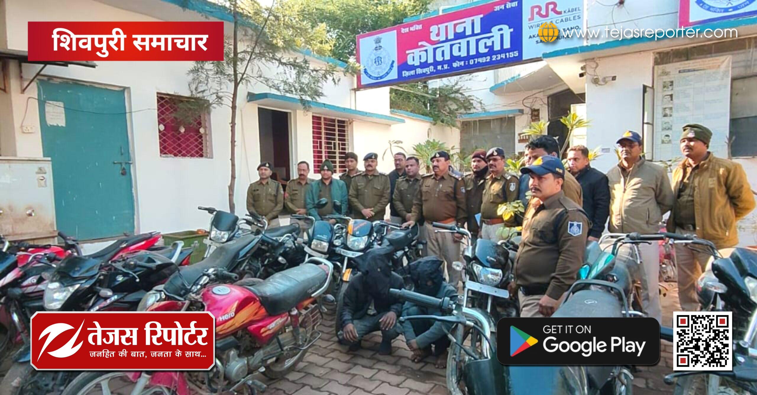शिवपुरी | नए साल की शुरुआत में ही शिवपुरी सिटी कोतवाली पुलिस ने अपराध पर बड़ा प्रहार करते हुए दो शातिर बाइक चोरों को गिरफ्तार किया है। इनसे चोरी की 14 मोटरसाइकिलें बरामद की गई हैं। सिटी कोतवाली टीआई कृपाल सिंह राठौर ने जानकारी दी कि पकड़े गए दोनों आरोपियों का पुलिस रिकॉर्ड पहले साफ था और यह उनका पहला मामला है।
