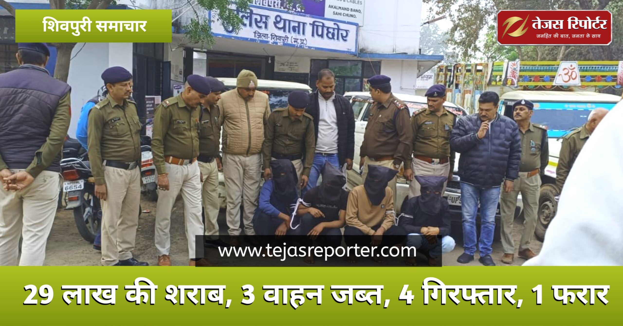 शिवपुरी जिले की पिछोर पुलिस ने अवैध शराब के खिलाफ बड़ी कार्रवाई करते हुए दो अलग-अलग मामलों में 77 पेटी शराब और तीन वाहन जब्त किए हैं। इस ऑपरेशन के दौरान पुलिस ने चार लोगों को गिरफ्तार किया, जबकि एक आरोपी फरार हो गया। जब्त शराब और वाहनों की कुल कीमत करीब 29 लाख 64 हजार रुपये आंकी गई है।