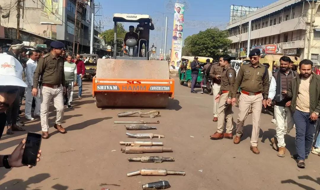 70 बुलेट साइलेंसर जब्त, पुलिस ने सड़क पर चलवाया रोड रोलर