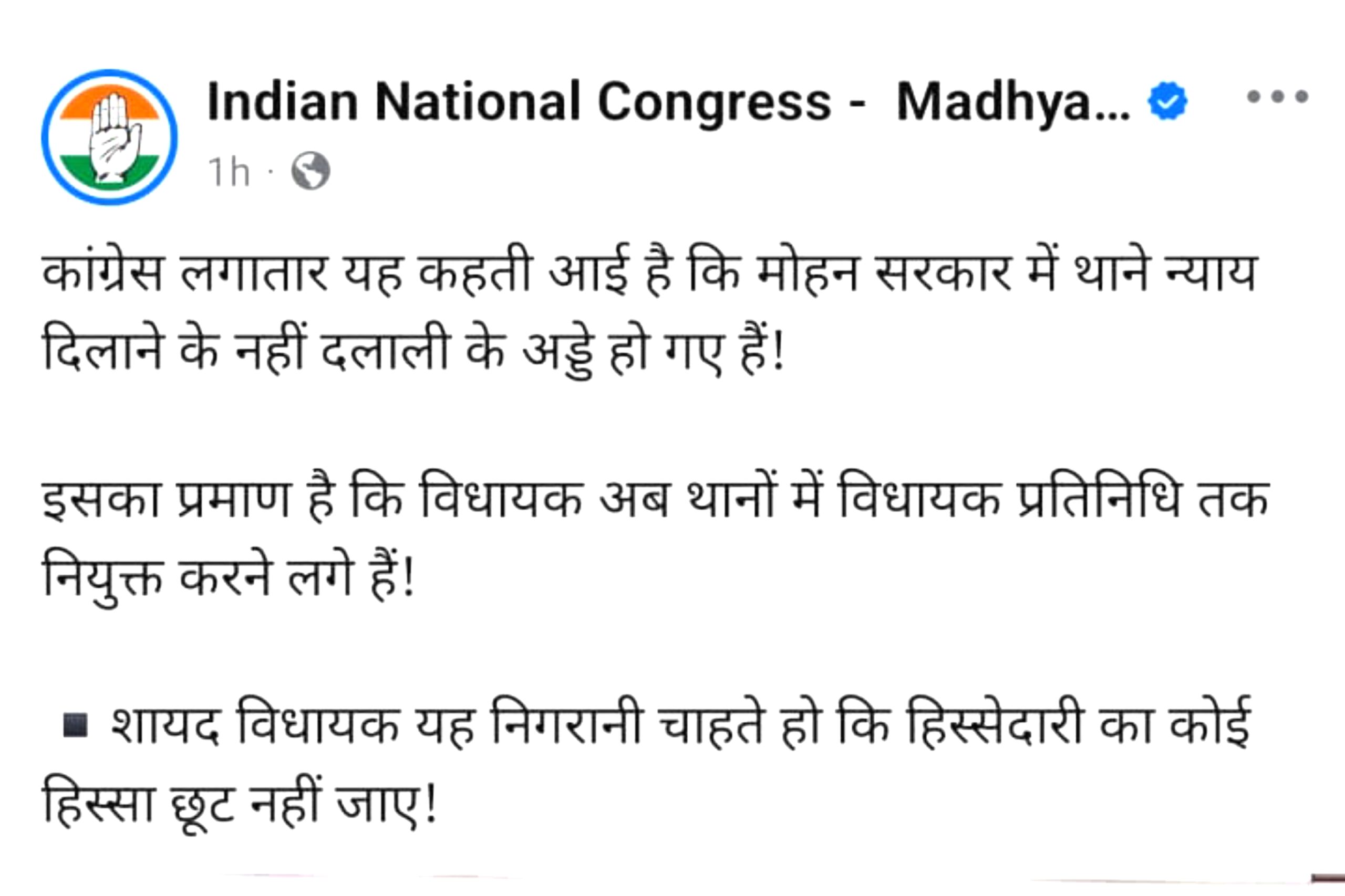 इंडियन नेशनल मध्यप्रदेश ने फेसबुक पर लिखा कि “कांग्रेस लगातार यह कहती आई है कि मोहन सरकार में थाने न्याय दिलाने के नहीं दलाली के अड्डे हो गए हैं!