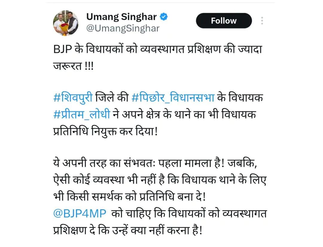 वहीं नेता प्रतिपक्ष उमंग सिंघार ने सोशल मीडिया पर पोस्ट करते हुए भाजपा को घेरा।