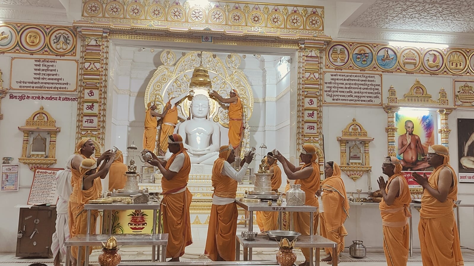 इस शुभ अवसर पर मंदिर के मूलनायक भगवान महावीर स्वामी की 7.25 फुट ऊंची प्रतिमा का प्रातः 7 बजे 51 श्रावकों द्वारा जलाभिषेक किया गया। प्रथम जलाभिषेक व शांतिधारा का सौभाग्य संतोषकुमारजी प्रवीण विपिन पहाड़िया परिवार को प्राप्त हुआ, जबकि द्वितीय शांतिधारा का लाभ चिरंजीलाल अशोककुमार भव्यकुमार पाटोदी परिवार को मिला। इसी क्रम में आदिनाथ भगवान की प्रथम शांतिधारा तेजकुमारजी पंकजकुमारजी प्रवीणकुमारजी बड़जात्या परिवार ने की, और द्वितीय शांतिधारा का लाभ विमलचंद विनयकुमार विकास पहाड़िया परिवार को प्राप्त हुआ। भगवान शांतिनाथ की प्रथम शांतिधारा का सौभाग्य केसरदेवी मातृश्री राजेशकुमार मनोजकुमार पांड्या परिवार को मिला, जबकि द्वितीय शांतिधारा लालचंद कमलकुमार सुभाषचंद सुनील पीयूष पहाड़िया परिवार ने की।