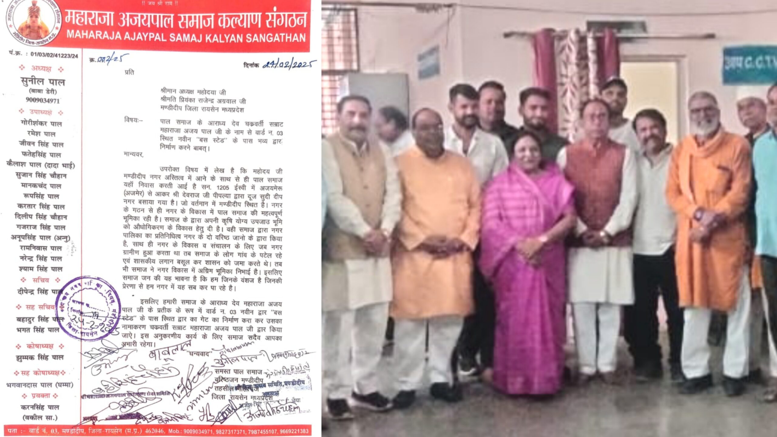 मंडीदीप | शहर के महाराजा अजयपाल समाज कल्याण संगठन मंडीदीप के प्रतिनिधिमंडल ने आज मध्य प्रदेश सरकार के पूर्व मंत्री एवं भोजपुर विधानसभा के विधायक आदरणीय श्री सुरेंद्र पटवा और नगर पालिका अध्यक्ष श्रीमती प्रियंका राजेंद्र अग्रवाल को एक सूत्रीय ज्ञापन सौंपा। संगठन ने मंडीदीप के वार्ड क्रमांक 03, नया बस स्टैंड पर महाराजा अजय पाल द्वार” निर्माण की मांग रखी, जिससे इस ऐतिहासिक व्यक्तित्व की विरासत को सम्मान दिया जा सके।