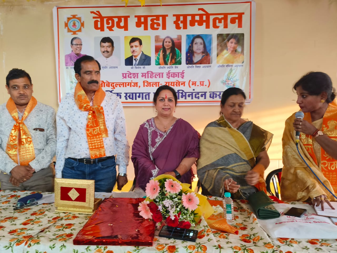 ओबेदुल्लागंज, रायसेन | नगर में आयोजित वैश्य महा सम्मेलन भव्यता और उल्लास के साथ संपन्न हुआ। इस आयोजन में महिला इकाई, मध्य प्रदेश की अध्यक्ष ज्योति जैन ने अपनी गरिमामयी उपस्थिति दर्ज कराई। वहीं, संभागीय अध्यक्ष डॉ. पी.के. जैन, रायसेन जिला अध्यक्ष विनोद जैन, तथा अन्य वरिष्ठ पदाधिकारियों ने कार्यक्रम की शोभा बढ़ाई।