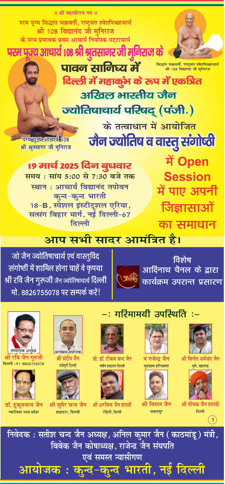नई दिल्ली, भारत की राजधानी दिल्ली में जैन ज्योतिष और वास्तु से जुड़ा एक ऐतिहासिक आयोजन 19 मार्च 2025 को होने जा रहा है। कुन्दकुन्द भारती, नई दिल्ली में आचार्य श्री १०८ श्रुत सागर जी मुनिराज के पावन सानिध्य में जैन ज्योतिष एवं वास्तु संगोष्ठी आयोजित की जाएगी। इस आयोजन में देशभर से आए श्रद्धालु खुली चर्चा के माध्यम से अपनी जिज्ञासाओं का समाधान प्राप्त करेंगे। संगोष्ठी के दौरान कार्यकारिणी कुन्दकुन्द भारती, दिल्ली द्वारा प्रतिष्ठित ज्योतिषाचार्यों एवं वास्तुशास्त्र विशेषज्ञों को सम्मानित किया जाएगा।