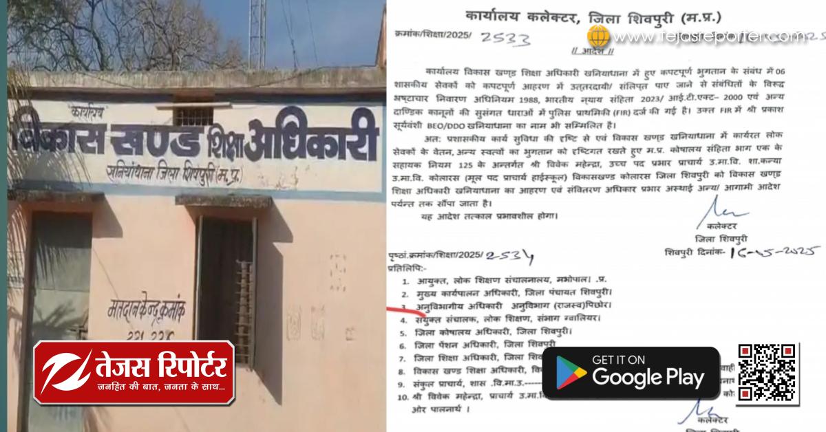 शिवपुरी | खनियाधाना विकासखंड शिक्षा अधिकारी कार्यालय में सामने आए लाखों रुपए के गबन मामले ने शिक्षा विभाग में हड़कंप मचा दिया है। इस आर्थिक अनियमितता में छह शासकीय सेवकों को कपटपूर्ण तरीके से राशि आहरण में संलिप्त पाया गया है। इनमें तत्कालीन खंड शिक्षा अधिकारी (बीईओ) प्रकाश सूर्यवंशी भी शामिल हैं, जिनके खिलाफ पुलिस ने प्राथमिकी (FIR) दर्ज कर ली है। साथ ही, उनके निलंबन का प्रस्ताव संभागायुक्त को प्रेषित किया गया है।