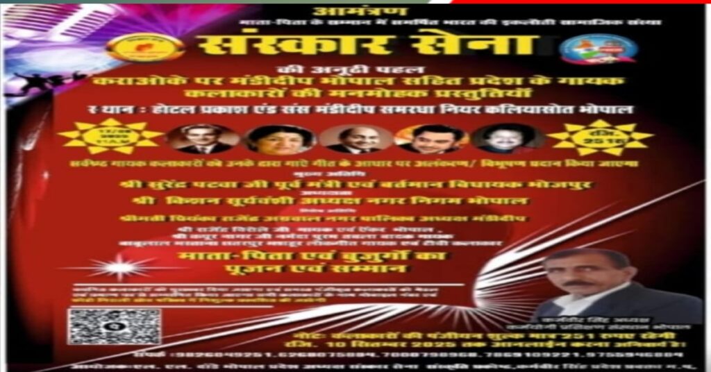 मंडीदीप | भारत की इकलौती सामाजिक संस्था संस्कार सेना ने माता-पिता के सम्मान और बुजुर्गों के प्रति आदर की भावना को जन-जन तक पहुँचाने के लिए एक और महत्वपूर्ण पहल की है। संस्था द्वारा प्रकाश एंड संस होटल, समरधा, भोपाल में आयोजित किया जाने वाला यह कार्यक्रम संगीत, नाट्य और सांस्कृतिक रंगों से सराबोर रहेगा।