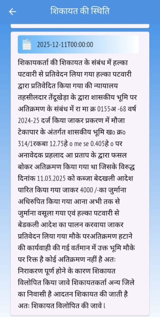पटवारी द्वारा दिए गए प्रतिवेदन के अनुसार: कब्जाधारी प्रहलाद आमप्रसाद द्वारा भूमि पर फसल बोई गई थी। तहसीलदार तेंदुखेड़ा ने 11.03.2025 को कब्जा बेदखली आदेश जारी किया। ₹4000 का जुर्माना लगाया गया। प्रतिवेदन के अनुसार अतिक्रमण हटाकर भूमि “रिक्त” पाई गई। लेकिन ये पूरा दावा ग्रामीणों ने खारिज कर दिया है।
