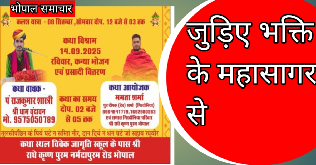 संगीतमय श्रीमद् भागवत कथा सप्ताह ज्ञान यज्ञ का भव्य आयोजन भोपाल में भक्तिमय वातावरण में होगा सात दिवसीय धार्मिक अनुष्ठान August 31, 2025 No Comments